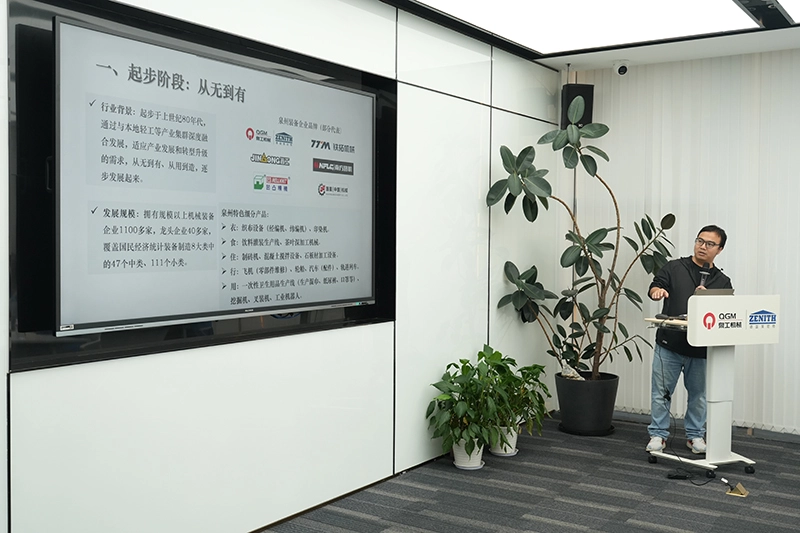 కాన్ఫరెన్స్ రూమ్లో, క్వాన్జౌ మునిసిపల్ బ్యూరో ఆఫ్ ఇండస్ట్రీ అండ్ ఇన్ఫర్మేషన్ టెక్నాలజీ యొక్క ఎక్విప్మెంట్ విభాగానికి చెందిన సిబ్బంది క్వాన్జౌ యొక్క పరికరాల తయారీ పరిశ్రమ యొక్క ప్రాథమిక పరిస్థితి, అభివృద్ధి చరిత్ర మరియు భవిష్యత్తు అవకాశాలను వివరించారు; Quanzhou మెషినరీ ఇండస్ట్రీ కో., లిమిటెడ్ యొక్క ప్రచార వీడియో కూడా చూపబడింది.